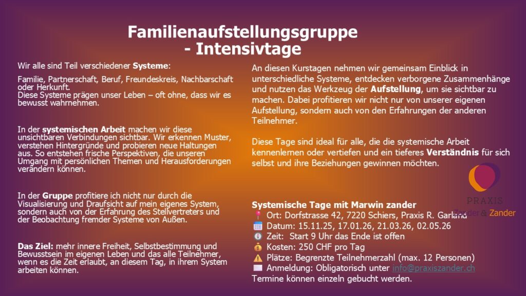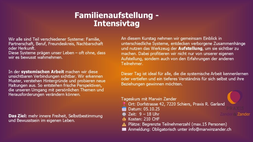 Die systemische Arbeit habe ich einmal als „MRI der Familie“ bezeichnet, weil man damit in etwas hineinschauen kann, das einem normalerweise verborgen bleibt. Systemisch zu arbeiten und eine (Familien-)Aufstellung zu machen, bringt daher nicht die Heilung aller meiner Probleme, sondern Klarheit, Wissen, Antworten, neue Sichtweisen und Bewusstheit. Wie nach einem MRI habe ich eine Idee vom Problem und kann danach eine Lösung entwickeln und anschließend umsetzen.